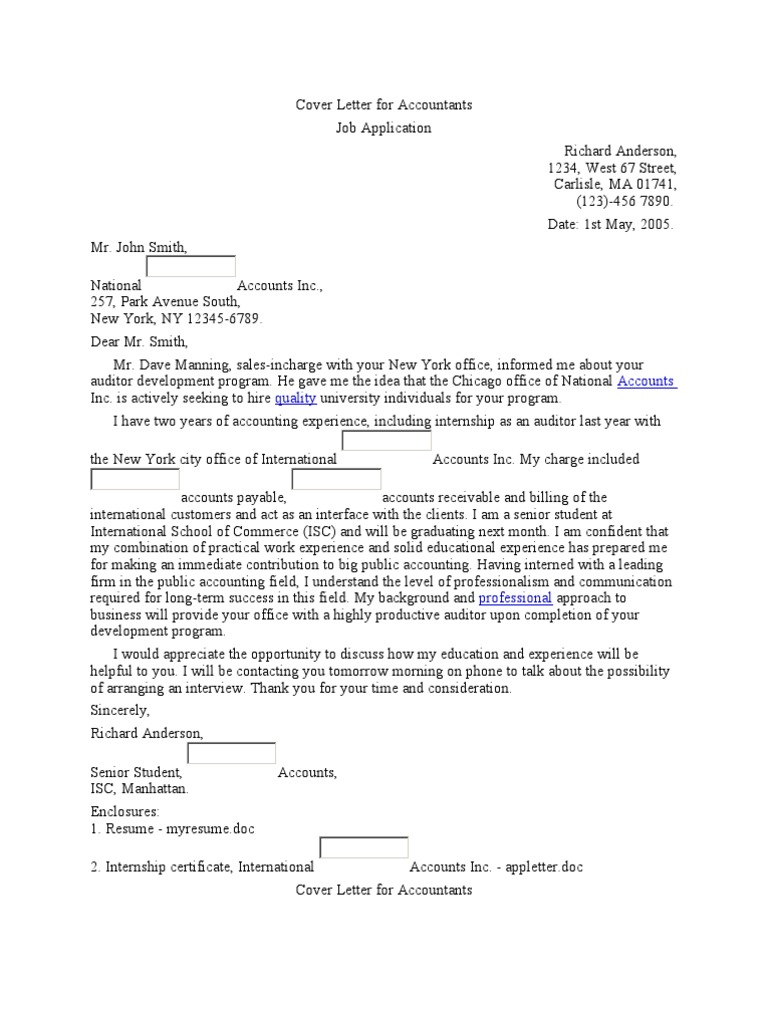 I lived for that feeling of pride when everything added up. How to write a winning cover letter for an accounting intern position? Accountancy is a practical field. Business analyst internship cover letter example. Writing a great accounting intern cover letter is an important step in your job search journey. I am a recent bachelor of commerce graduate with a major in accounting, seeking the opportunity to implement. Find tips on how to stand out, avoid common mistakes, and land the job you want. A convincing cover letter is key to your resume receiving the interest it deserves. In los angeles, ca as advertised on indeed.com. During the course of my career, i have gained a specialist's understanding of financial instruments and accounting software and have also been effective in explaining complex information. Internship programs are usually completed by students who want to accumulate job experience. Writing a great accounting intern cover letter is an important step in getting hired at a new job, but it can be hard to know what to include when i found your job posting for the position of accounting internship with abc company, i immediately knew this was the summer internship for me. Focus your resume and cover letter on your experiences, your academic achievements, certifications, and awards. Tips for an accounting cover letter. The accounting industry is competitive, so whenever you submit a job application, you want to know that yours stands out. This entry level accounting cover letter example page will help you leverage your education and internship experience to get your first accountant job. Successful baker mckenzie cover letter contributed by a cover letter library member for baker mckenzie financial services legal intern in singapore on. This cover letter is in regards to my interest in applying for the business analyst intern job within dds corporation, inc. Your cover letter is your introduction to a potential employer i have two years of accounting experience acquired through my internship with grant thornton llp where i used my analytical skills to improve. The accounting internship cover letter is an important part as like as a resume. Writing a cover letter for an internship. Below, we're going to give you a formula for writing a great accounting internship cover. So carry it with your resume when you will go to the company for a job. This cover letter is a good example for recent graduates who have a degree in accounting. My name is richard sanchez, and i am a recent accounting graduate with extensive internship experience in preparing invoices, analyzing. Your cover letter is going to be the thing that gets your foot in the door when you are searching for jobs as a training internship. If you are still an accounting undergraduate gunning to. Accountant cover letter sample 1: The letter is sent together with the resume and other information saying why you are qualified for the job position. Let's break down your internship cover letter using this template. Accounting internship cover letter sample.
