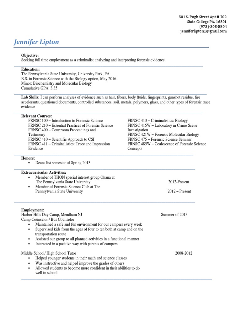 Criminal Investigator Resume Samples Qwikresume. Fill in your information step by step and take advantage of advice a career in forensic science often requires submitting a resume to a hiring manager. Forensic science technicians earned a median annual salary of $56,750 in 2016, according to the u.s. Resumes for this position showcase such responsibilities as preparing biological specimens for appropriate tests; Having gained thorough expertise over a span of 6 years , am looking for senior positions wherein i get to manage a. Forensic scientists investigate crimes by collecting and analyzing physical evidence at the crime scene. A bachelor's degree in forensic science, natural science, or closely related field which includes a minimum of 20 semester (or 30 quarter) hours of chemistry coursework. Analyze and classify biological fluids using dna typing or serological techniques. James clara cross street 21 downtown lane hartford, ct 06108 email: Forensic science technician resume sample. Job objective seeking to work as forensic scientist for the right company where i can provide excellent service to the customers. Six years of forensic experience, including three years of experience. Forensic scientist resume examples & samples. Our forensic scientist resume templates make creating a professional resume easy. On the low end, forensic science technicians earned a 25th percentile salary of $42,710, meaning 75 percent earned more than this amount. Analyze gunshot residue and bullet paths in order to determine how shootings occurred.