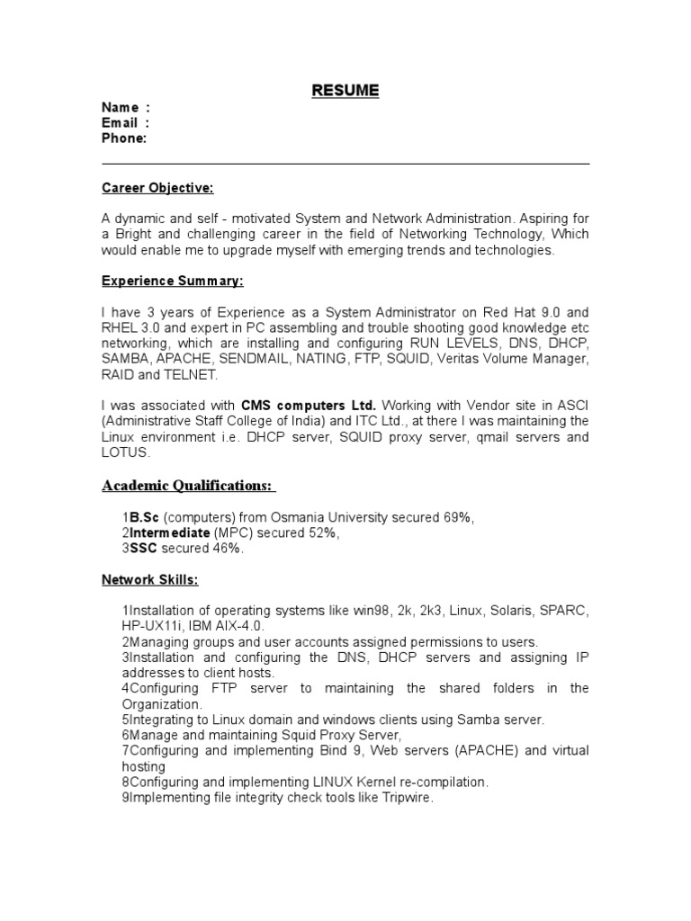 System Administrator Resume Sample Windows 2000 System Administrator. Read our complete guide to writing a professional resume for network. Maxine curry dayjob limited the big peg 120 vyse street birmingham b18 6nf england t: Network administrators are in charge for the implementation and maintenance of computer network systems in a company. 0044 121 638 0026 e: Another network administrator resume template; The more concise your resume the better. A network administrator resume should have organized sections. This article provides sample resume templates for network administrator. Use this free network administrator resume template to apply for your next job. Ideally, a network administrator resume should be 2 pages or under. The network administrator resume samples and network administrator resume examples provided. A network administrator resume sample that gets jobs. The sections should contain your skills, work history, education, contact information, certification, and other relevant information. Network administrator resume sample inspires you with ideas and examples of what do you put in the objective, skills, responsibilities and duties. Example resumes are categorized based on experience level so you can select and customize the sample resume which.