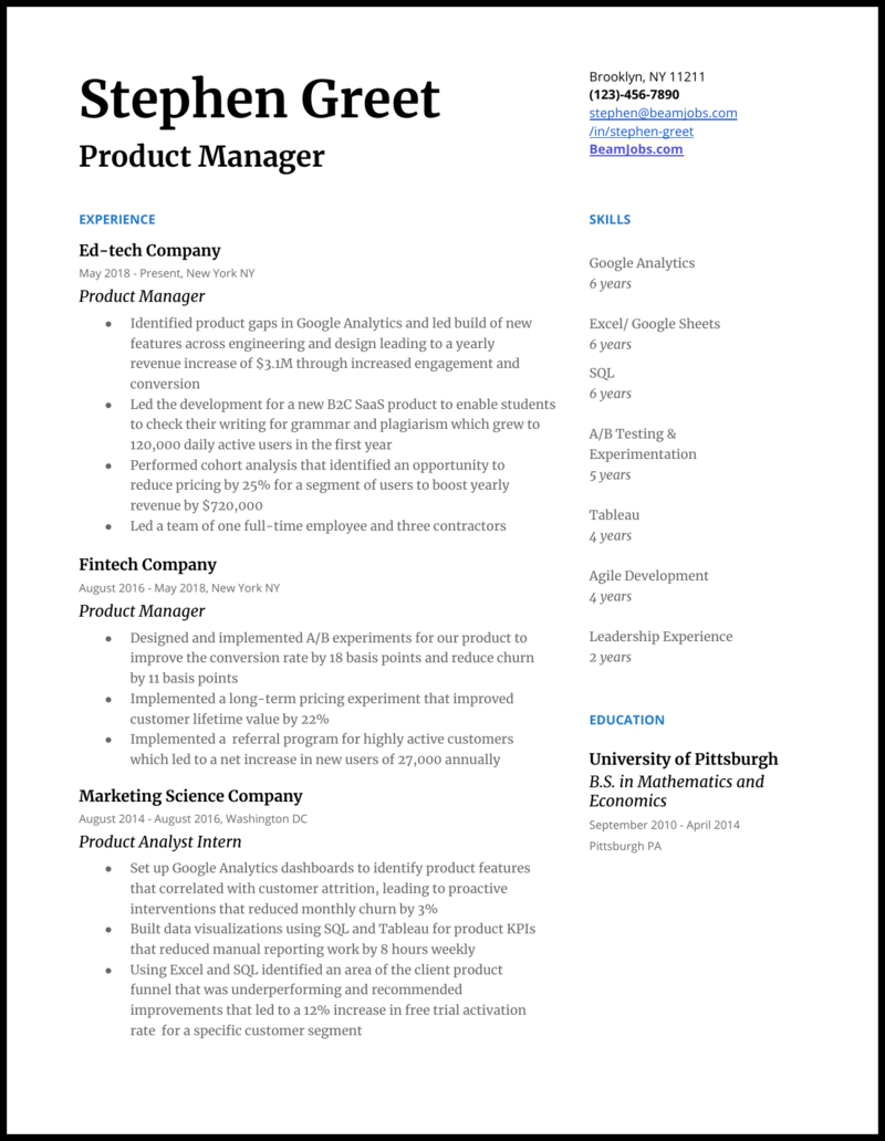 Strategic analyst / product manager resume. Product manager resume sample tips on how to write the perfect product manager resume product manager resume example. This assistant manager resume templates can be designed for the professional structure. Tons of product manager resume samples and inspiration you can use in customizing this resume template. How confident are you feeling about your resume? Product manager resume & guide with twelve free resume examples. So, you can choose any format of the resume. Customize this resume with ease using our seamless online resume builder. As a product manager, your ultimate goal is to generate or increase sales of your product, and your resume is a great opportunity to succinctly highlight your past success in this area. Writing a great product manager resume is an important step in your job search journey. How to write a product manager resume. This is what your product manager resume should look like. Product manager / management resume examples. Charles dickinson 489 12th street northwest washington, dc 20006 telephone no: I love establishing approaches that emphasize inclusiveness and team. Just fill in your details, download your new resume & start your. The first step towards crafting a product manager resume and cover letter that will land you interviews at top. The following product manager resume samples and examples will help you write a resume that best highlights your experience and qualifications. Read our complete guide to writing a this guide will show you: Listing your achievements in a resume can feel like a thankless task. Seeking a position as a product manager with alpha inc., offering outstanding ability to analyze market segments, promote products, and initiate strategies to drive sales and improve product profitability. Browse and use 11 resume samples. With these resume examples as a starting. Job ad wants these product. Why take the long way around? First, your product manager resume is not a master cv of all your qualifications. They collaborate with company leaders to develop a product vision and then work closely with engineers and designers to bring the product to. Click to download calley's product manager resume example. Examples of product manager objective statement for resume. The latter two examples clearly demonstrate why the product manager applying for the role is a good fit. 1/ i build products for enterprises, emerging technologies and creative industries.