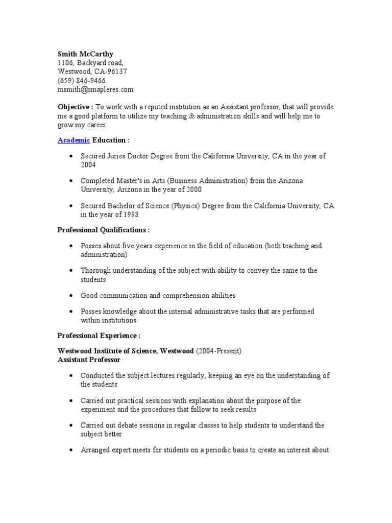 College professor resume example ✓ complete guide ✓ create a perfect resume in 5 minutes using our resume examples & templates. You can edit this college professor resume example to get a quick start and easily build a perfect resume in just a few minutes. The best resume examples for your next dream job search. Writing a professional resume is a very important step in your job hunt. Professional professor resume examples & samples. Resume format pick the right resume format for your situation. Download sample resume templates in pdf, word professor resume. This business teacher resume sample which is available as free download features the requirements for a business teacher. Resume action verbs and vocabulary are especially useful in a professor's resume. Implemented an individualized education plan for students with unique needs. Or maybe you're having a hard time deciding what job experiences to include. How to write a resume learn how to write a resume that lands you jobs. Resume templates choose resume template and create your resume. Our resume samples and writing tips can help guide you through the process. Check out our other guides One is of an adjunct professor of law and the other for a clinical professor. What every professor resume needs to include is a strong list of professionally presented experience. Resume examples see perfect resume samples that get jobs. You may want to tailor it to fit a specific job description. If you want to see results like this, tune in! College professor resume example ✓ complete guide ✓ create a perfect resume in 5 minutes using our resume examples & templates. Their teaching duties include supporting students studying for a degree, developing instructional plans. Many sample teachers resume templates and formats are available over the web. Writing tips, suggestions and more. Finding the inspiration to write an awesome resume can be tough. College professor resume sample tips on how to write the perfect college professor resume college professor resume example. The best professor resume samples. 20+ professor resume samples to customize for your own use. Include a header that contains your name, address, phone number, email. Ambitious individual, with 5+ years of legal experience and 5 years dealing with litigation matters. Resume examples view our resume examples by industry.